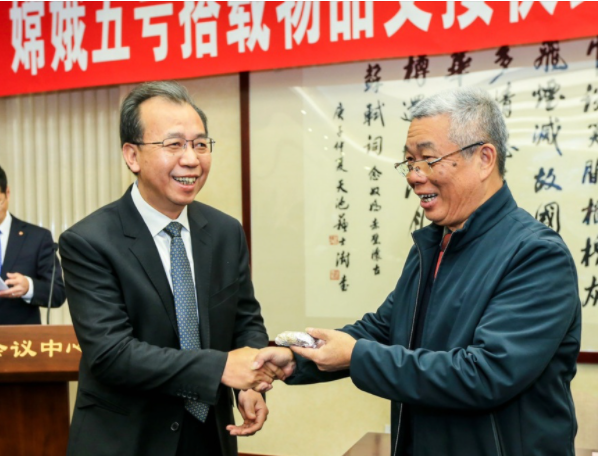 探月與航天工程中心主任劉繼忠(左)將搭載種子交付給陳志強(qiáng)(右)主任。受訪單位供圖