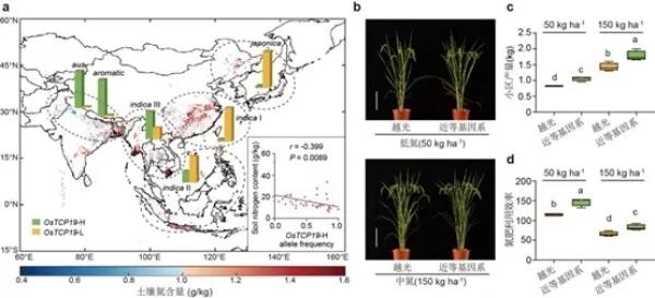 這一關(guān)鍵氮高效基因的鑒定依賴于一個(gè)多樣性的“農(nóng)家種”水稻群體資源。這些農(nóng)家種是在現(xiàn)代高產(chǎn)水稻品種推廣之前,也就是氮肥大量施用之前,世界各地農(nóng)家種植的本地品種。世界各地氣候土質(zhì)的差異造就了農(nóng)家品種豐富的遺傳多樣性。研究通過(guò)對(duì)水稻種子庫(kù)中這些“古早”的水稻品種開(kāi)展基因遺傳分析,最終定位了基因組上這一關(guān)鍵變異。通過(guò)對(duì)世界水稻種植區(qū)土壤氮含量數(shù)據(jù)分析,研究發(fā)現(xiàn),土壤越貧瘠的地方,OsTCP19氮高效變異越常見(jiàn),并隨著土壤氮含量的增加,氮高效類型品種逐步減少,而我國(guó)現(xiàn)代水稻品種中這一氮高效變異幾乎全部丟失。將這一氮高效變異重新引入現(xiàn)代水稻品種,在氮素減少的條件下,水稻氮肥利用效率可提高20-30%,也就是說(shuō),在水稻生產(chǎn)中,使用更少的化肥,也能達(dá)到相同的產(chǎn)量。