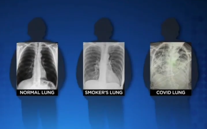 X射線圖像顯示,已康復的冠狀病毒患者肺部留下的疤痕和損傷比吸煙者的肺部更嚴重。正常的肺部是深色且透明的,吸煙者的疤痕會使其部分變白,而冠狀病毒患者的部分則幾乎是不透明的。