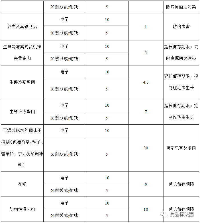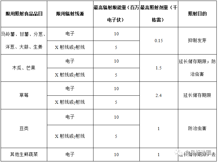 臺灣輻照食品的標準為《食品輻射照射處理標準》,規(guī)定允許照射的食品品類及限用的輻射線源、最高輻射限能量、劑量以及照射目的,具體如下: