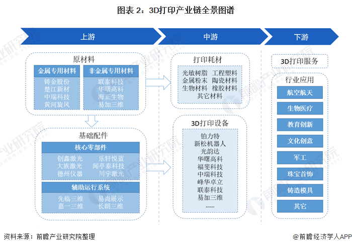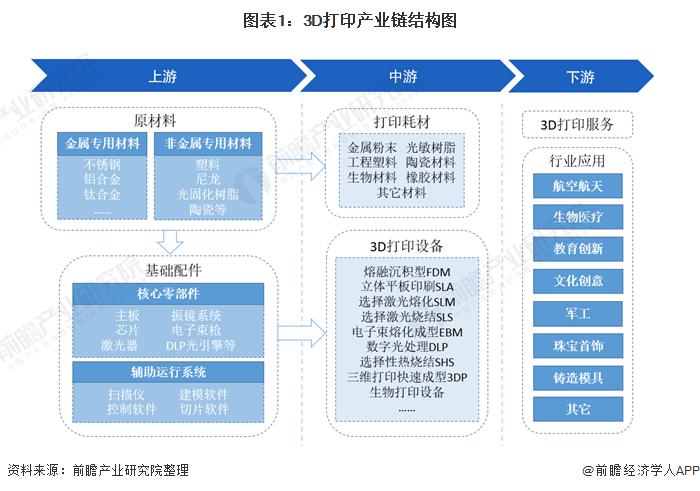 中游為3D打印耗材(金屬粉末、光敏樹脂、工程塑料、陶瓷材料、生物材料等)及3D打印設備的研發制造;