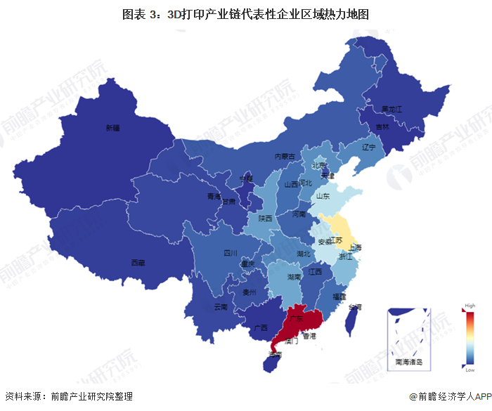 3D打印產業鏈區域熱力圖:中國3D打印產業集聚態勢明顯