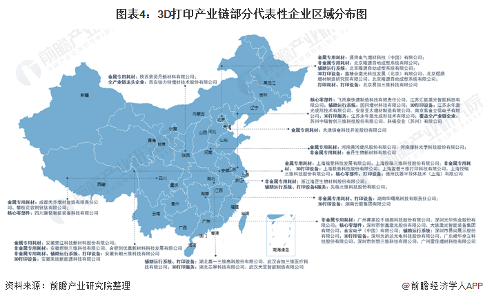 3D打印產業鏈主要分為三個部分:上游原材料及基礎配件,中游3D打印耗材及3D打印設備的研發制造,下游3D打印服務及應用。其中,工業級金屬3D打印設備是未來發展的重點方向。中國3D打印產業鏈代表性企業分布在廣東、江蘇、山東、安徽等地區,中國3D打印產業集聚態勢明顯。