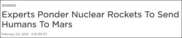 據(jù)美國全國公共廣播電臺(NPR)2月24日報道,美國國家科學院核動力研究小組主席、獨立航天顧問羅杰·邁爾斯(Roger Myers)與他的同事近日發(fā)表了一份報告,稱核動力火箭很可能是載人登陸火星項目的“核心技術”。