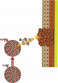 靶向的α粒子轟擊了癌組織。由洛斯阿拉莫斯國家實驗室開發的發生器可容納鈾-230,該鈾會衰變成釷-226。進一步的衰變會產生短暫的子代同位素,再發射出四個α粒子,從而導致很高的組合輻射劑量以破壞癌細胞。