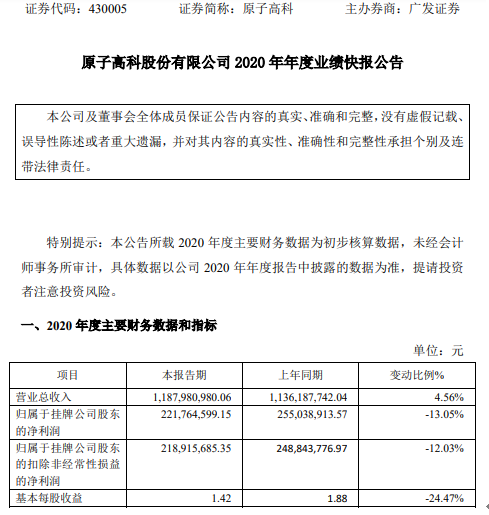 4月1日,原子高科發布2020年度業績快報公告,顯示2020年度公司實現營業總收入11.88億元,同比上升4.56%,實現歸屬于掛牌公司股東的凈利潤2.22億元,同比下降13.05%。收入增幅較以往年度有所下降及凈利潤下降的主要原因是受到疫情影響。此外,對聯營企業的投資收益下降、新投產醫藥中心運營初期虧損、公司加大研發投入力度導致研發費用增加、新租用辦公樓導致成本費用上升等導致利潤下降。