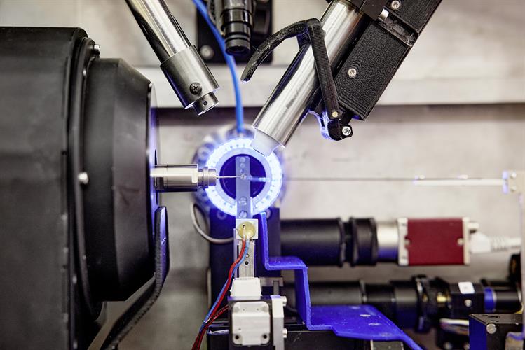 測量站P11處的樣品架(左)在來自PETRA III加速器的X射線光下旋轉(zhuǎn)樣品。同時,一股冷氮氣流冷卻了樣品。借助許多來自不同方向的散射圖像,可以計算出蛋白質(zhì)-藥物復合物的分子結(jié)構。圖片由DESY / C / Schmid提供。