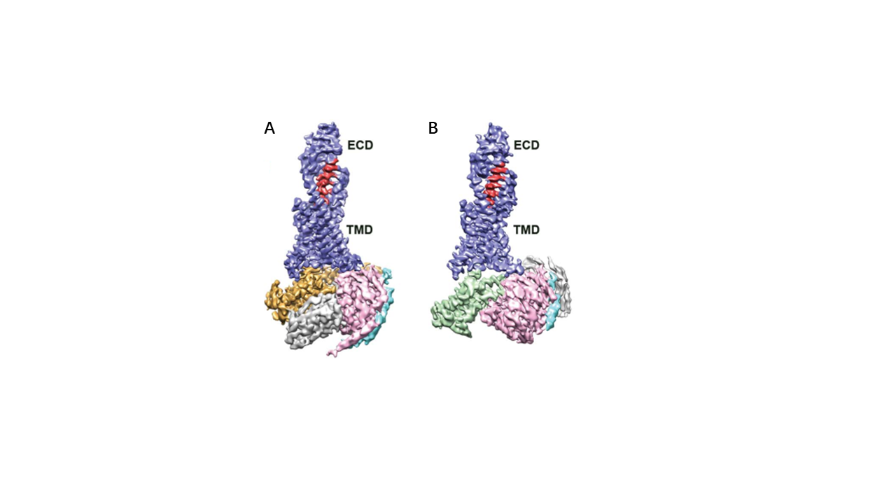 近幾十年,冷凍電子顯微鏡發展迅速,在結構生物學領域逐漸發揮出舉足輕重的作用。早在1939年,西門子公司制造了世界上第一臺商業化的電子顯微鏡。為了防止高真空及強烈的電子轟擊對樣品的破壞,人們用重金屬染色或糖包埋的方法處理樣品。但由于都對樣品進行了破壞性處理且都是在常溫條件下進行觀察,所以分辨率都受到了限制。到1984年,J. Dubochet等人發展了冷凍生物樣品的方法并總結了得到玻璃態冰的方法1,2,這是最早的快速冷凍技術(cryo-freezing) 并開啟了“冷凍” 電子顯微鏡時代。通過將生物大分子的溶液樣品快速投入至冷卻到液氮溫度的液態乙烷中,得到冰層厚度合適的冷凍樣品,然后對冰層中均勻分布的生物大分子顆粒進行拍照,得到上千張照片。通過算法對拍到的二維照片進行分析,最終得到其結構,此方法稱之為單顆粒分析技術(single particle analysis)。近些年,隨著直接電子探測相機(direct detection device, DDD)的出現和各種數據處理軟件的發展,冷凍電子顯微鏡解析的生物大分子三維結構所占比例越來越大(見圖1)。比如2020年3月發表在Science雜志的研究通過冷凍電子顯微鏡單顆粒分析技術,確定了與胰高血糖素及不同類別的異源三聚體G蛋白(Gs或Gi1)結合的人源胰高血糖素受體(GCGR)3.7 Å和3.9 Å的結構(見圖2)。該研究的多個結構與藥理學數據相結合,為II型糖尿病和肥胖癥的治療提供了重要見解3。