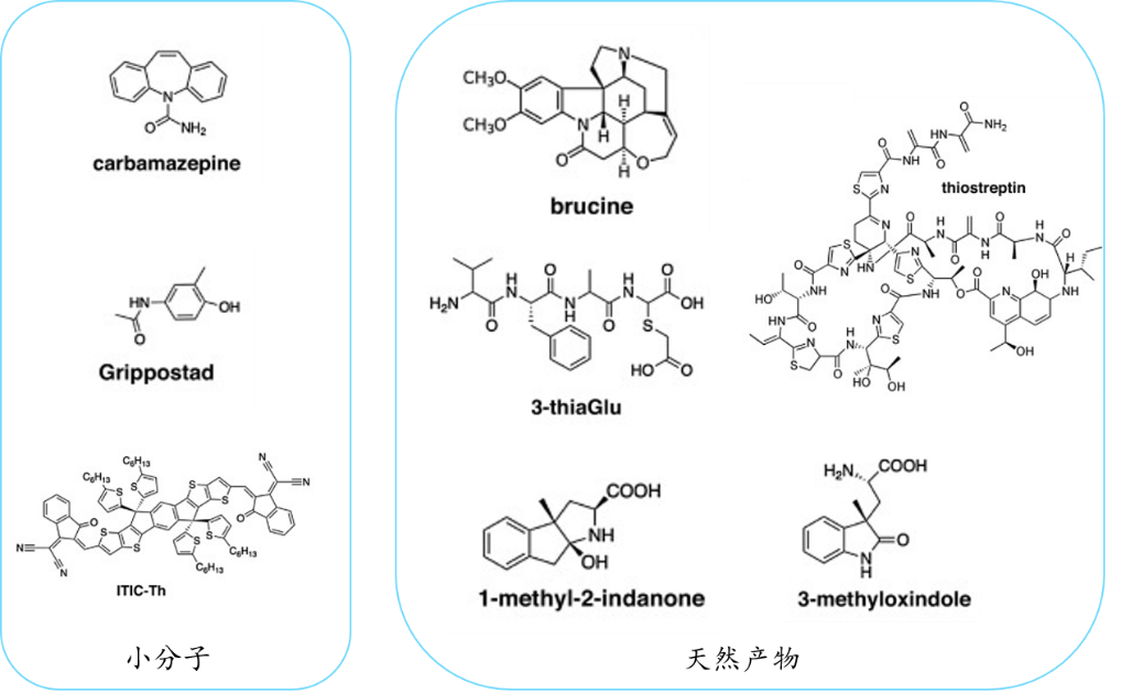 由于MicroED的獨特優勢,除了生物大分子之外,其對化學小分子、天然產物、藥物制劑的研究更是再合適不過了。因為化學小分子呈現粉末狀,尺寸上與MicroED的研究范圍非常契合,而且基本可以在幾個小時內從粉末得到其結構信息。很多利用MicroED研究化學小分子的成功案例都驗證了此技術的高效性和應用性(見圖6)。MicroED在生物大分子和小分子藥物上的研究展示了其在結構生物學領域的巨大應用潛力,為結構生物學家提供了一個前景廣闊的新工具。
