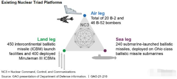 2021年5月6日,美國政府問責辦公室發布了“三位一體”核力量報告。該報告稱,美國國防部計劃更換或現代化現有“三位一體”核力量平臺(包括潛艇、洲際彈道導彈和轟炸機),以及多個核指揮、控制和通信系統。美國能源部計劃對核基礎設施進行現代化,延長使用壽命,并生產核彈頭和核武器。在達到美國戰略司令部的作戰要求時,國防部現有在役核武器系統將面臨挑戰。