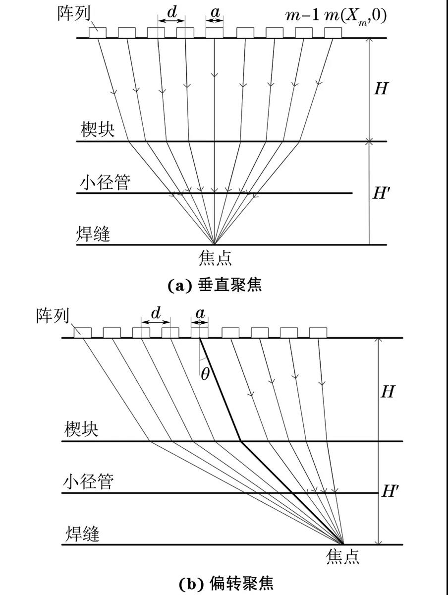 軸向分布的陣列可按線陣聚焦法則來計算。設探頭至楔塊/鋼界面的距離為H,實際焦點至小徑管內壁的距離為H′,則聚焦探頭所需的焦距F為:F=H+(c1/c2)•H′