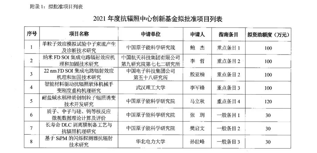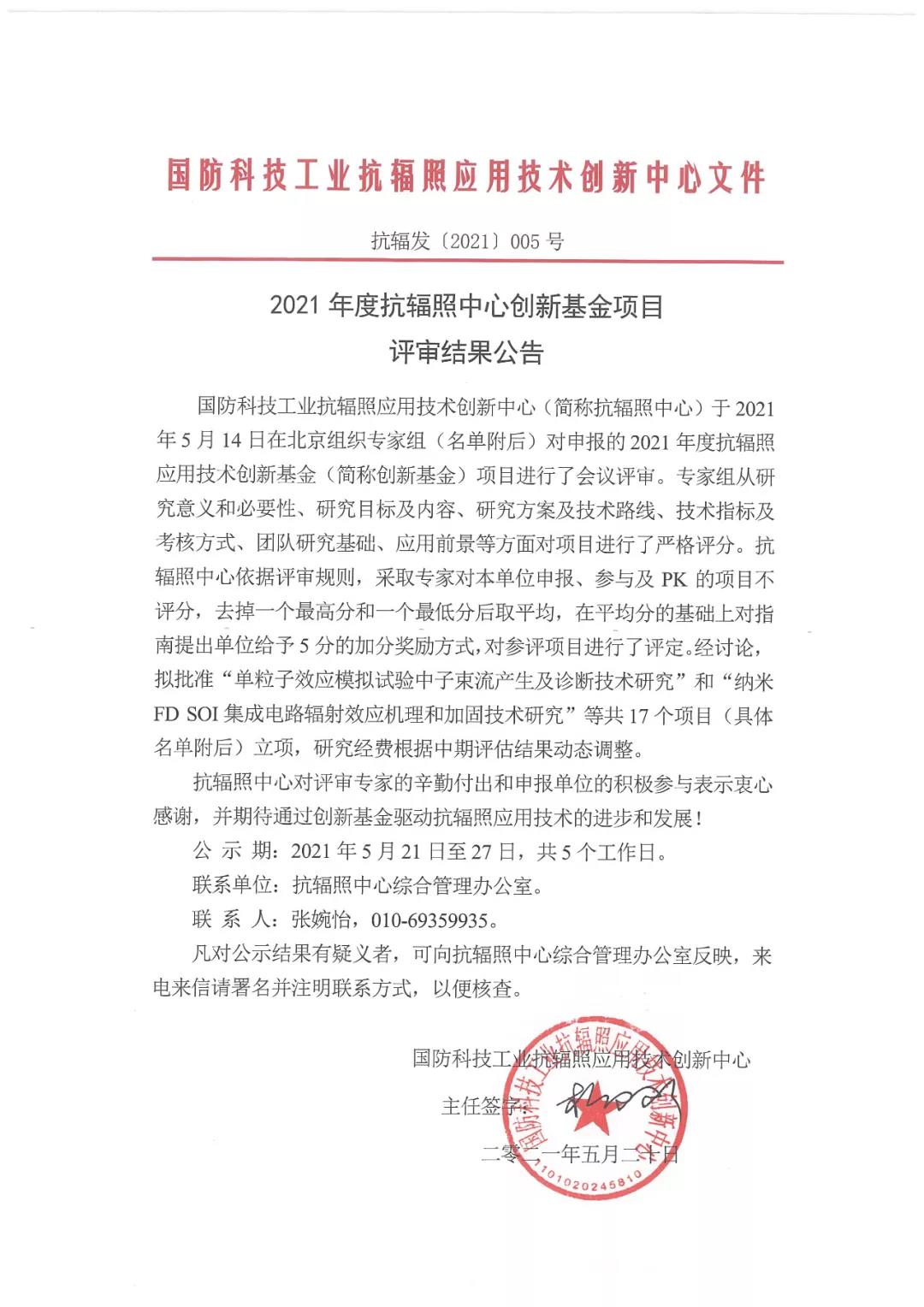 2021年度抗輻照中心創(chuàng)新基金項(xiàng)目評(píng)審結(jié)果公告