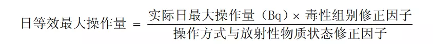 放射性日等效最大操作量等于:放射性核素的實際日最大操作量(Bq)與該核素毒性組別修正因子的積,除以與操作方式有關的修正因子所得的商3,4。其計算公式為: