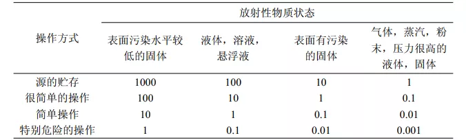 為了歸一化描述非密封源對環(huán)境及操作人員的影響,《電離輻射防護與輻射源安全基本標準》(GB18871-2002)3中,使用了“日等效操作量”來描述。其意義在于:將不同毒性、不同操作方式的各種核素,用修正的方法“折算”成同一水平,便于判斷該工作場所的級別,并制定相應等級的操作要求和進行相應級別的管理,是輻射環(huán)境管理和輻射環(huán)境保護的重要依據。