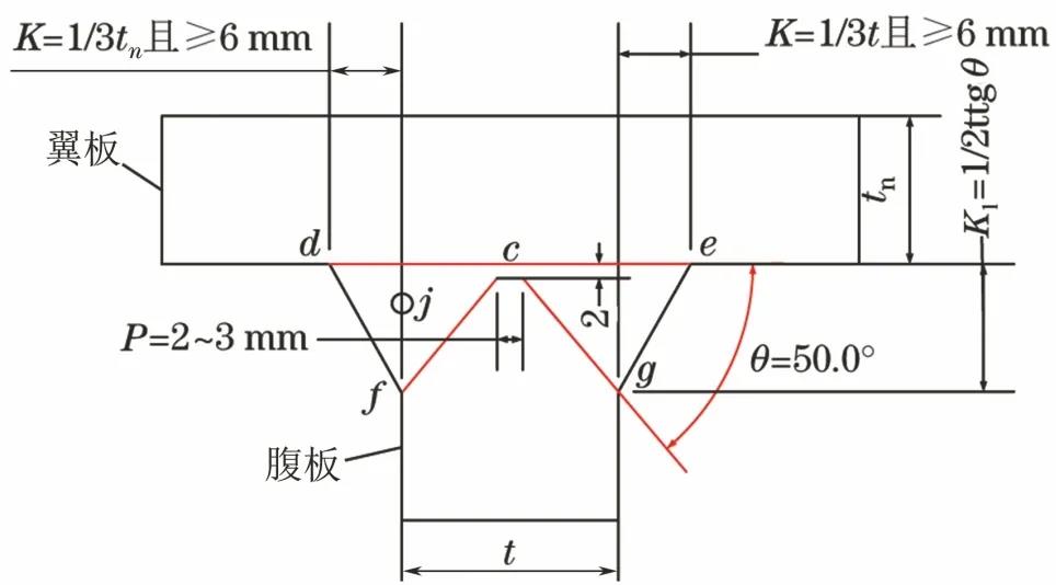 式中:K1為腹板焊腳尺寸;β為線段df與法線方向的夾角。