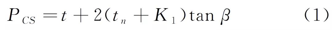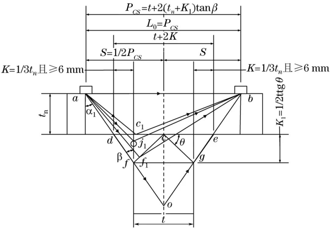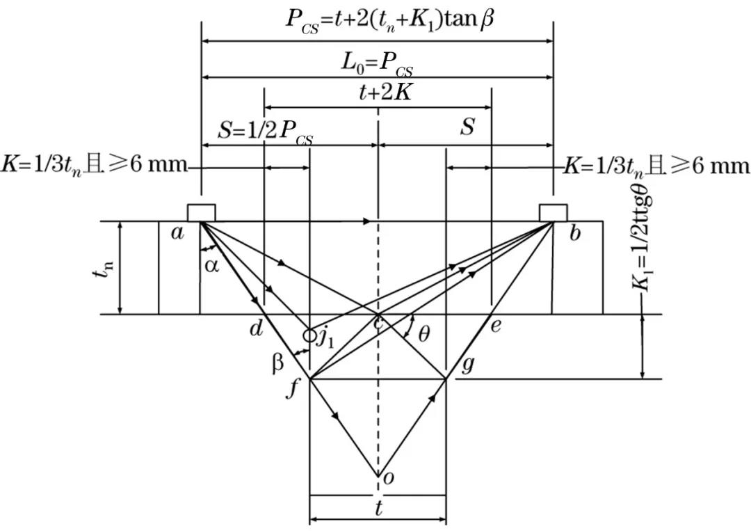 探頭布置同前,PCS=t+2(tn+K1)tgβ,直通波聲程L0=PCS。
