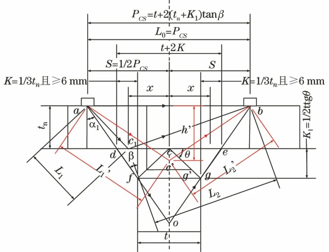 以相同方式布置探頭,PCS=t+2(tn+K1)tanβ,直通波聲程L0=PCS。以類似方式設定模擬等腰三角形,模擬路徑聲程等于實際路徑聲程。