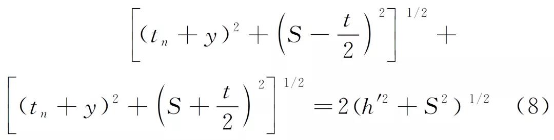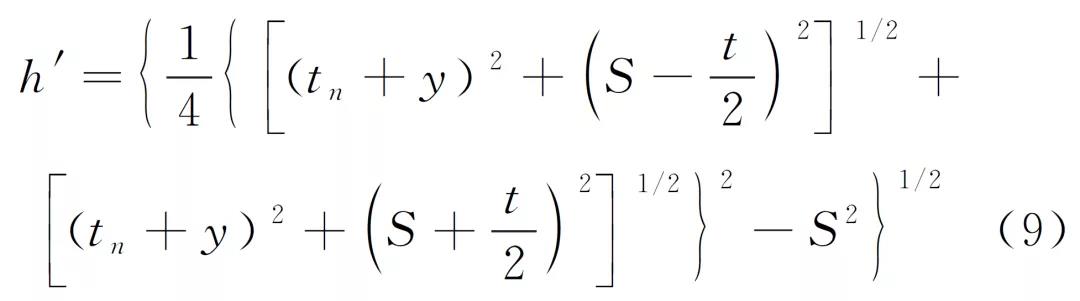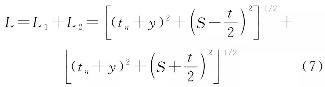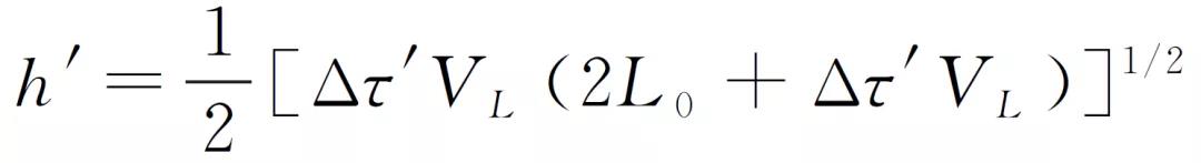 在中心線上可確定一點c′,使路徑ac′b與路徑ac1b的聲程相等。c′點稱為模擬衍射點,經模擬衍射點的路徑ac′b稱之為模擬路徑,其聲程L′=L′1+L′2=2(h′2+S2)1/2稱之為模擬路徑聲程。模擬路徑聲程等于實際路徑聲程,即L=L′。模擬衍射點c′與翼板上表面之間的距離h′稱之為模擬深度。以直通波聲程L0為底邊,模擬路徑ac′b半聲程為斜邊的等腰三角形ac′b稱之為模擬等腰三角形,模擬深度h′即模擬等腰三角形底邊的高。