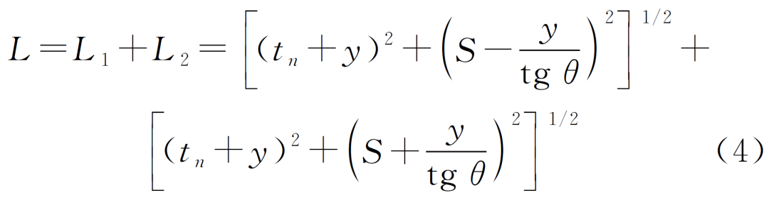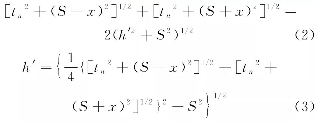 按前述原則建立模擬等腰三角形aj′b,則模擬路徑聲程L′=L′1+L′2=2(h′2+S2)1/2,可得:
