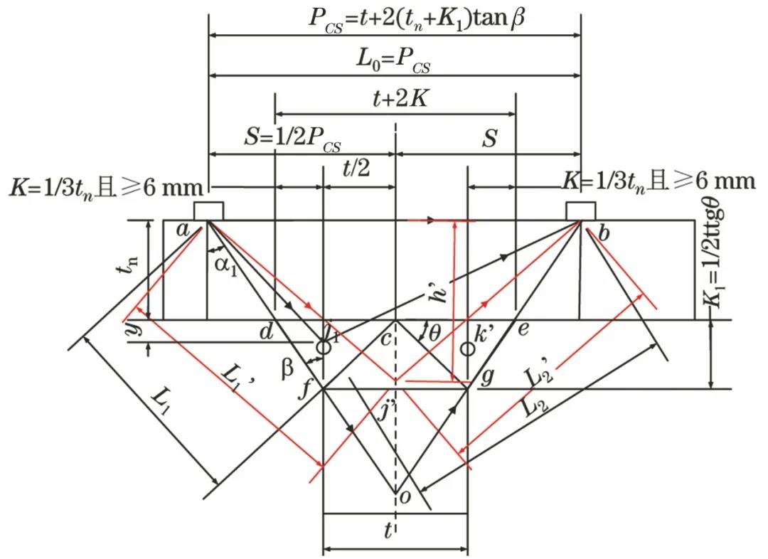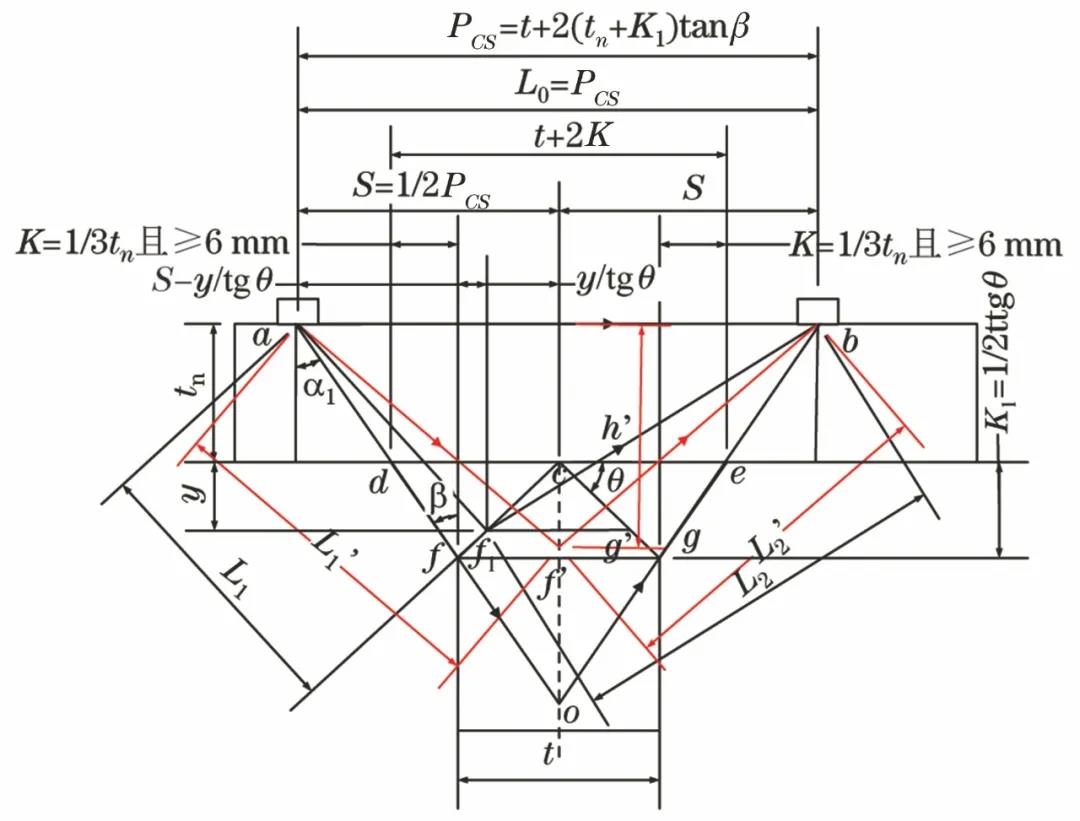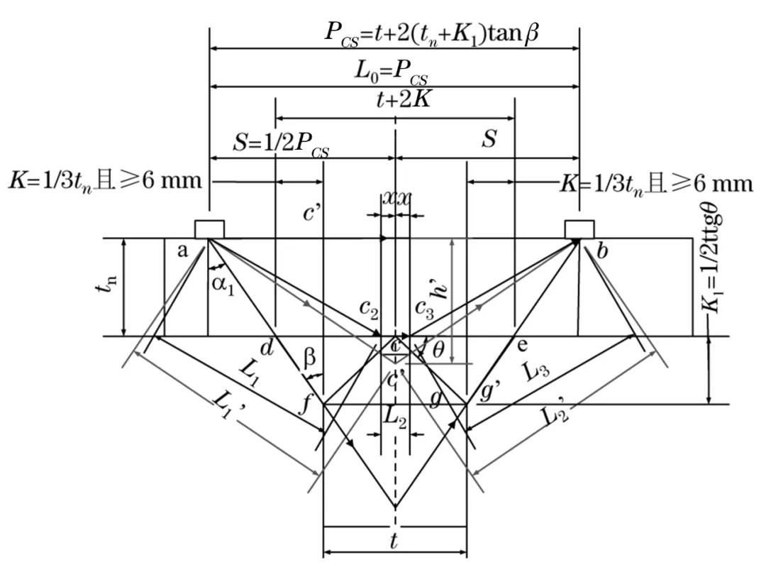 T型接頭TOFD檢測非平行掃查探頭布置如圖2所示,其布置方式為發射探頭與接收探頭均置于翼板上表面,分別位于角焊縫外邊緣延長線與翼板上表面的交點a、b處,并對稱于接頭中心線(簡稱中心線)。即探頭某一角度為α1的聲束與角焊縫外邊緣線df、ge相切,以確保聲束對角焊縫的全覆蓋。兩探頭某一角度為α1的聲束交點位于接頭中心線上O點。圖中探頭a為發射探頭,探頭b為接收探頭,直通波沿翼板上表面路徑ab傳播。