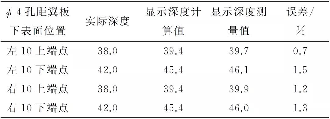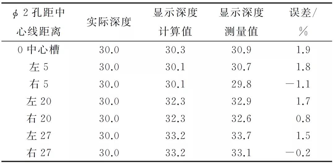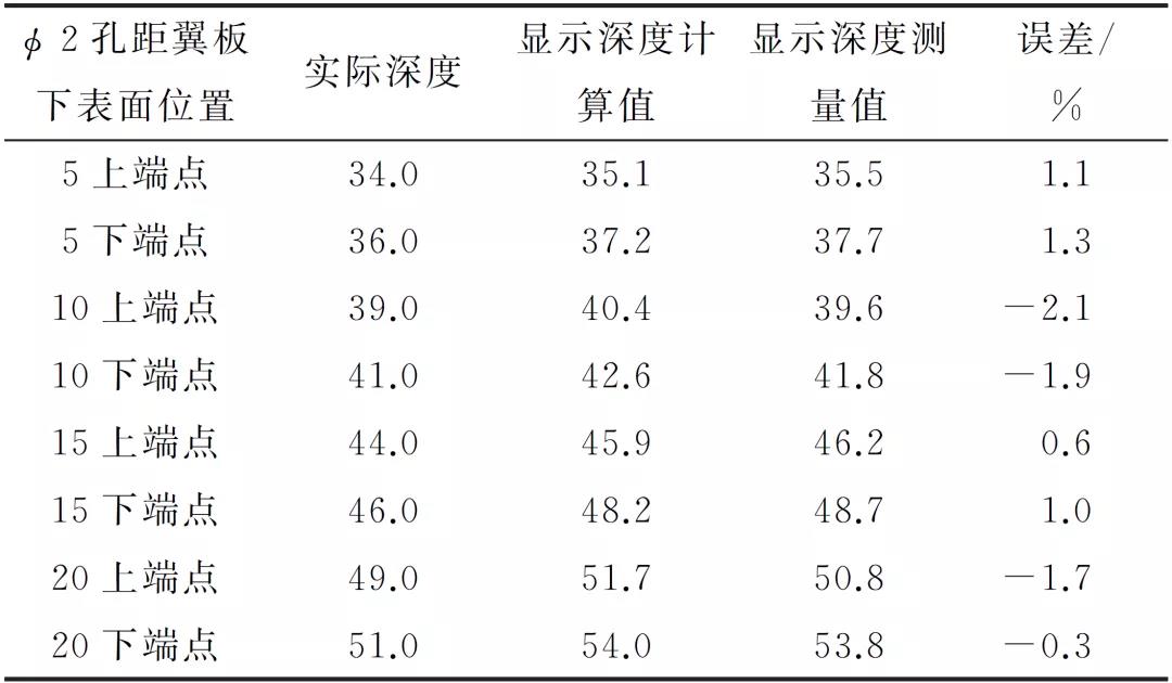 表1 翼板下表面中心槽及Φ2mm孔上端點實際深度、顯示深度計算值與測量值(mm)