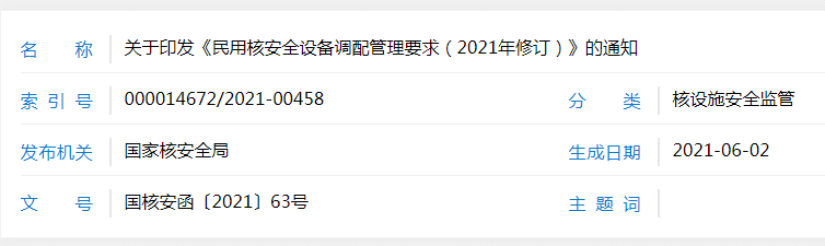 關于印發《民用核安全設備調配管理要求(2021年修訂)》的通知