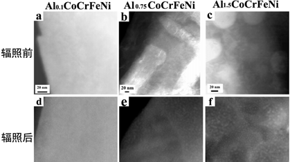 圖1. (a ~ c)輻照前和(d ~ f)輻照后含鋁高熵合金AlxCoCrFeNi的高角環形探頭暗場像. (a,d) x= 0.1, (b,e) x = 0.75, (c, f) x = 1.5.