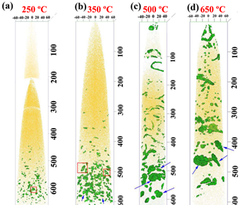 圖2. 利用APT表征得到的Al0.1CoCrFeNi在不同溫度下((a) 250 ºC,(b) 350 ºC,(c) 500 ºC,(d) 650 ºC)的鎳,鈷-55 at. %等濃度表面分布(綠色),黃色代表沉積的金原子,藍色箭頭標明了鎳和鈷在位錯環上的偏析。