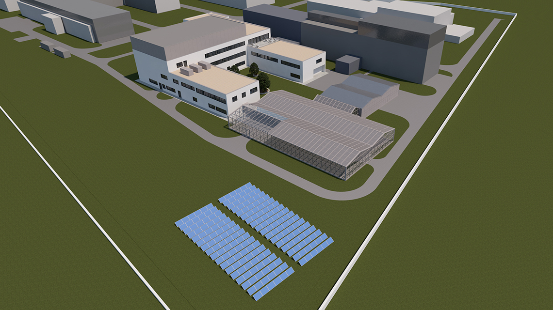 新的靈活模塊實驗室(FML2)大樓和溫室的擬議設計的建筑效果圖。