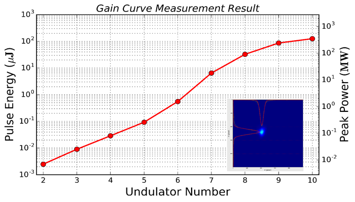 專家組詳細審核了測試內容、測試方法和測試大綱,聽取了項目研制報告和自測報告,并進行了現場測試。測試結果表明:用戶波蕩器束線輸出自由電子激光性能已達到并優于驗收指標與設計指標,自由電子激光波長為1.97 nm,脈沖長度為360 fs,最大峰值功率為342.0 MW,平均峰值功率為202.6 MW;活細胞成像束線X射線在線能譜儀達到驗收指標,其分辨率不低于1.22×103@624.7eV。