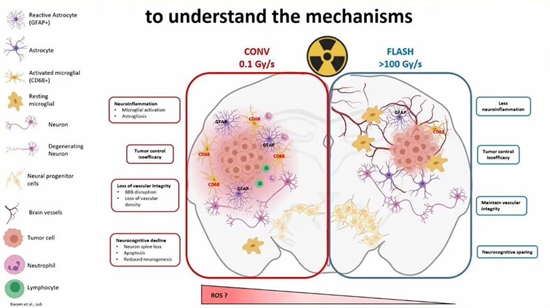 Prof. Vozenin介紹其進行的生物學實驗顯示,與傳統放療相比,FLASH腫瘤控制等效,可減少神經炎癥、維持血管完整性、保護神經認知,這些作用可能與活性氧(reactive oxygen species, ROS)相關。UHDR照射引起的差別效應提示正常組織和腫瘤組織之間存在根本差別。