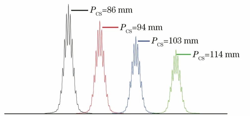 針對長457mm、寬40mm的工件進行建模,焊縫工藝參數為:坡口角度30°;間隙2mm;鈍邊高度1mm。選用標準NB/T 47013.10-2015中的推薦參數設置探頭頻率為5MHz,晶片尺寸為Φ6mm,楔塊角度為65°,聲束交點深度分別選擇在0.5T,0.55T,0.6T,2/3T的位置(T為工件厚度),依次進行聲場仿真分析,探頭中心間距PCS分別對應選擇86,94,103,114mm。