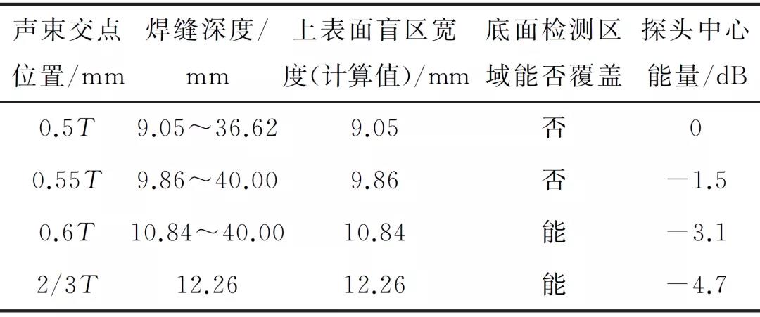 分析圖1,2與表1可知,聲束交點深度在0.5T與0.55T的位置,檢測區域不能覆蓋底面區域;交點在0.6T與2/3T位置時,均能在-12dB聲束覆蓋范圍內有效覆蓋檢測區域,上表面盲區隨著聲束交點的位置下移而增大,探頭聲束交點中心能量不斷減小。