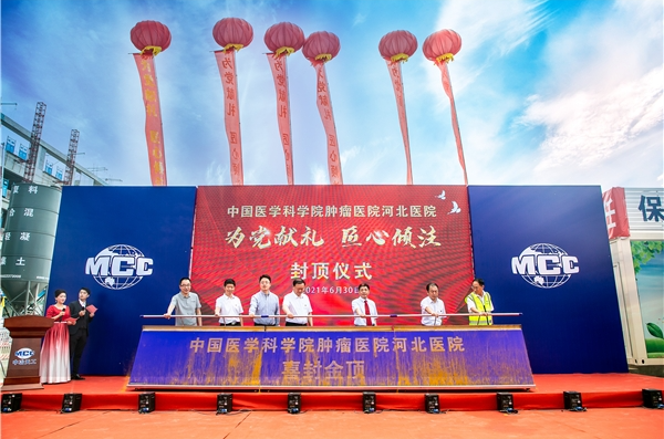 6月30日,中國醫學科學院腫瘤醫院河北醫院項目一期工程(第一部分)主體結構封頂。廊坊開發區工委書記、管委會主任王一平,廊坊開發區工委委員、管委會副主任孫紹虎,廊坊開發區工委委員林秋鴻,中國醫學院腫瘤醫院副院長蔡建強,院長助理李寧,中冶吉信健康產業有限責任公司總經理何林,中冶天工集團總經理王振堂出席封頂儀式。廊坊市委書記楊曉和,中國科學院院士、國家癌癥中心主任、中國醫學科學院腫瘤醫院院長赫捷分別發信祝賀。