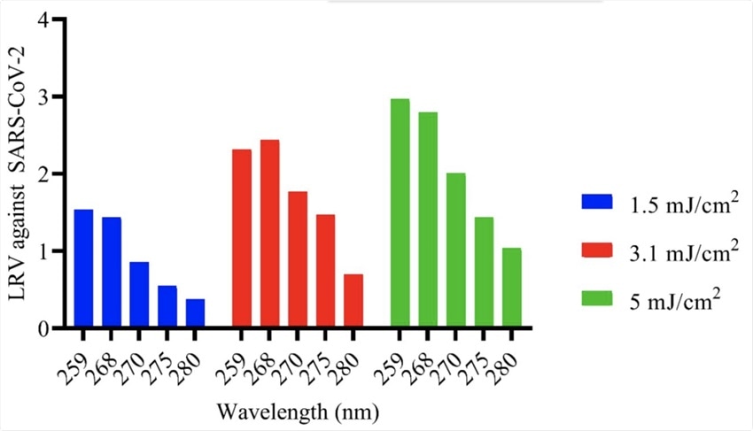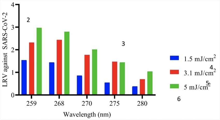 此前,研究人員證明了 SARS-CoV-2 對 UVC 輻射的敏感性,發現其在 259 和 268 nm 處最有效。在他們目前的研究中觀察到測試陣列的波長和滅活水平之間存在很強的關聯,從而證實滅活隨著 UVC 暴露/劑量的增加而增加。