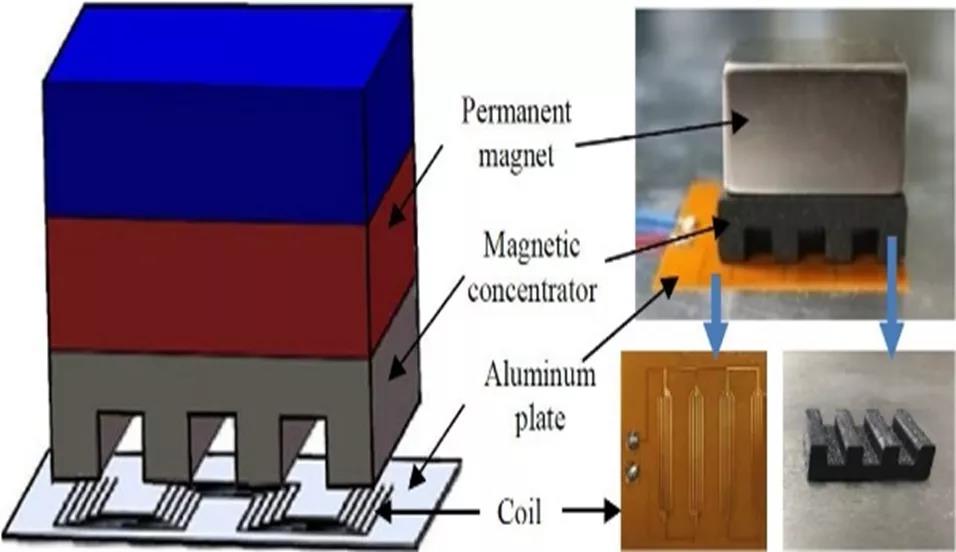 為了提高電磁聲換能器(EMAT)激發超聲導波模態的單一性,研制了一種先進的指向型磁集中器式電磁聲傳感器(D-MC-EMAT),用于在平板中激發出單一的S0模態信號。磁集中器被添加到傳統的EMAT中,以引導和聚集由永磁體提供的偏置靜磁場,改變磁通密度的分布,消除了不需要的A0模態。有限元仿真和試驗結果表明,所提出的D-MC-EMAT通過添加磁集中器改善了傳統EMAT的模態選擇性和缺陷檢測能力,同時D-MC-EMAT具有較好的頻率響應特性和聲場指向性。指向型磁集中器式電磁聲換能器結構如圖3所示。