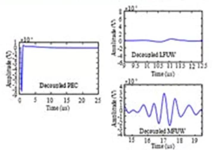 為了提高電磁超聲測試的效率和魯棒性,提出了針對鐵磁性材料的磁聲復合檢測方法。通過電磁聲換能器的一次檢測可同時獲得超聲和脈沖渦流(PEC)信號。EMAT利用磁致伸縮效應和洛倫茲力機制的耦合所產生的超聲波來檢測鐵磁性材料。在保持模型幾何形狀和EMAT其他參數不變的條件下,通過耦合不同的物理場,建立了3個EMAT仿真模型。其中,橫波可以由磁致伸縮力產生,縱波可以由洛倫茲力產生。對仿真結果進行時頻分析發現,超聲波和PEC的信號能量分布在不同的頻率范圍內。利用濾波器和時域信號分離方法,可以從EMAT信號中分離出磁致伸縮力超聲波(MFUW)、洛倫茲力超聲波(LFUW)和PEC對應的信號等成分。所提方法實現了一次EMAT檢測即可提取多個參數,提高了電磁超聲傳感器的檢測能力。鐵磁性材料EMAT檢測信號分離示意如圖4所示。