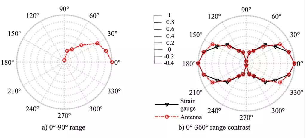 根據應變花測量原理,確立貼片天線應變傳感器對結構應變的全向檢測方法,即只需獲取貼片天線3個角度上頻率的變化值,便可確定結構的主應變大小及方向。建立了應變全向檢測系統(見圖7),并結合試驗條件設計制作了拉伸試件。在拉伸試件上表面的受力均勻區域黏貼微帶貼片天線,同時,在試件下表面的相同區域黏貼電阻應變片。在加載不同主應力的情況下,分別利用圓形微帶貼片天線應變傳感器和電阻應變片測量了不同平面夾角方向的應變變化曲線。由測量結果可知,2種檢測方法測量結構應變的數值一致,表明利用圓形貼片天線可表征結構應變的大小及方向,并且試驗中最小可分辨的平面夾角為15°。應變隨角度變化關系如圖8所示。此外,相較于電阻應變片,圓形貼片天線應變傳感器只需1組即可實現結構應變大小及方向的無源無線測量。
