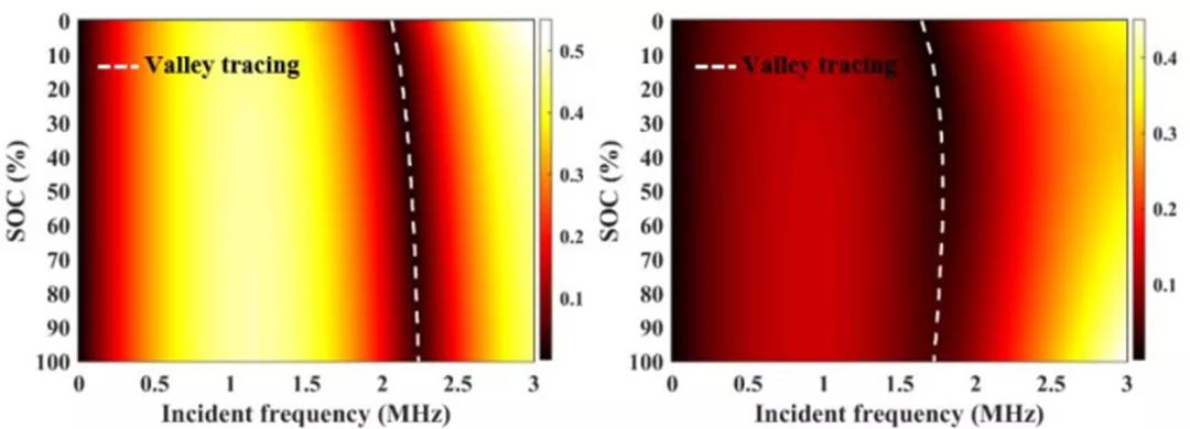 該研究對鋰離子電池中超聲波的反射特性做出了清晰與全面的表述,首次提出了用勒讓德正交多項式法求解一單元與多單元鋰離子電池的反射系數。理論結果表明,反射系數的角頻譜和頻譜隨SOC呈現規律性偏移,因此其可以用來表征SOC。有限元模擬得到的結果與該方法高度吻合,驗證了該方法的可行性(見圖12~14)。