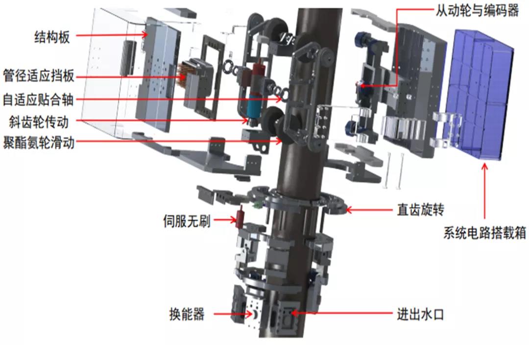 該系統包括計算機、多通道超聲系統控制電路、電機驅動板、空心杯電機、旋轉電機、爬管機器、多通道壓電換能器檢測環等(見圖17)。其中,多通道壓電換能器沿爐管周向布置,用于檢測爐管的內壁裂紋;計算機通過無線網絡向多通道超聲系統控制電路發送檢測指令;多通道超聲系統控制電路控制多路同時激勵壓電換能器,并接收來自壓電換能器的回波信號,然后將回波信號通過無線的方式傳回計算機,同時,系統控制電路向電機驅動板發送運動指令;電機驅動板驅動空心杯電機帶動爬管機器運動,并接收電機編碼器傳回的運動參數,通過系統控制電路發回至計算機,實現自動檢測。爬管檢測機械結構如圖18所示。該發明解決了制氫爐管內壁蠕變裂紋原位檢測的問題,實現了對爐管內壁蠕變裂紋的無線、遠程超聲自動檢測。