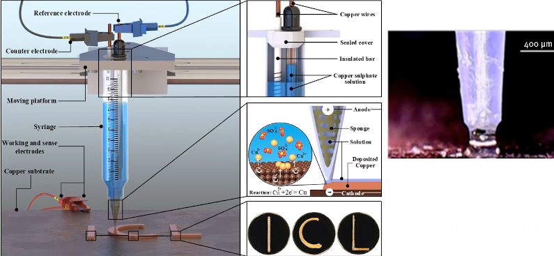 主要原理是:打印頭是一個裝滿電鍍液的注射器,在很小的區域上電鍍。速度相對較慢,如果太快,性能效果將大打折扣。通過使用帶有不同電解質的打印頭,可以使用不同的金屬進行打印。例如,視頻顯示了由銅和鎳制成的結構。您也可以反轉電流來去除金屬而不是沉積金屬。