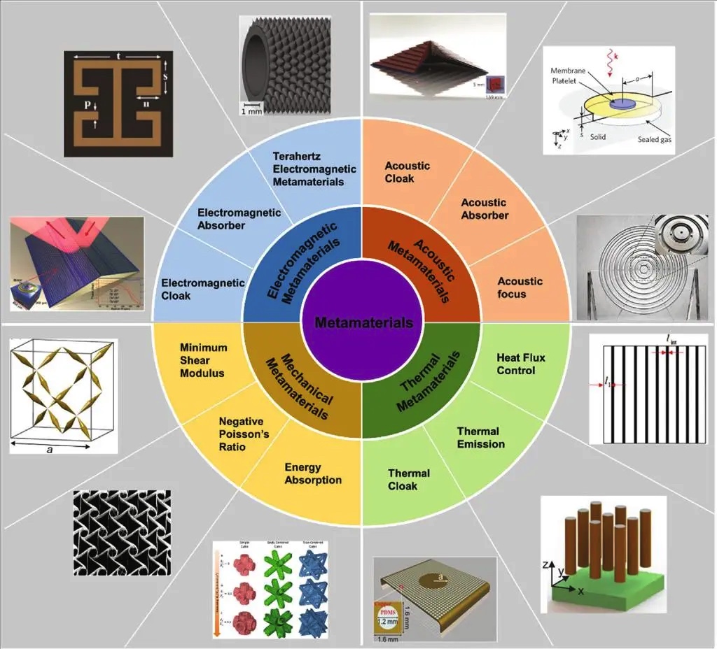 近年來,超材料受到越來越多科研工作者的關注,各種各樣具有不同物理特性的超材料被設計出來。根據超材料的功能不同,目前超材料大致可分為四類:電磁超材料、聲學超材料、熱學超材料和機械超材料,根據其具體的原理和應用領域不同,將上述四類超材料進一步細分為:(1)電磁隱身超材料、電磁吸收超材料、太赫茲電磁超材料等;(2)聲隱身超材料、聲波吸收超材料、聲波聚焦超材料等;(3)熱流控制超材料、熱隱身超材料和熱輻射超材料等;(4)吸能超材料、負泊松比超材料、最大體模量超材料等,如圖1所示。