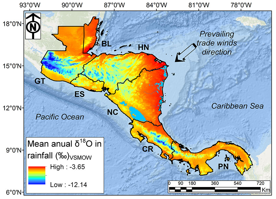 隨著最近整個 CADC 的采樣活動,目的是獲得降雨、地表水和地下水中穩定同位素變化的更好的空間和時間覆蓋。降雨穩定同位素數據集由每周和每天收集的 1,873 個樣本(2013-2018 年)組成。地下水來自井和泉水,而地表水僅從主要河流和溪流中采樣。結合檔案和最近的同位素數據,在國際原子能機構同位素水文部門的寶貴幫助和使用 GNIP 數據庫的幫助下,該團隊能夠為中美洲地峽開發區域化降雨等值線圖。實際上,isoscape 是同位素分布圖,在這種情況下,它允許確定降雨-地下水補給相互作用。