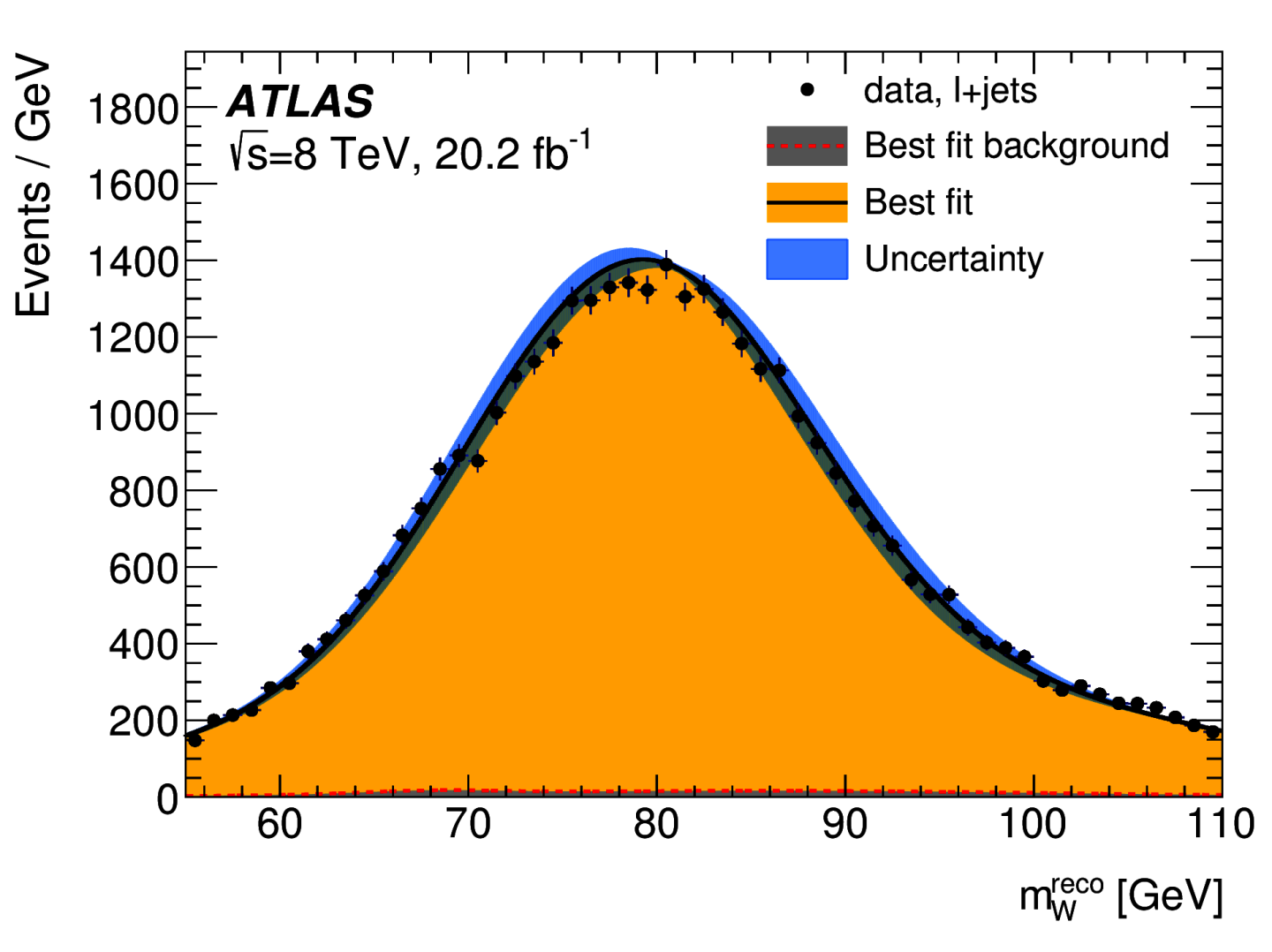 將這種技術(shù)應(yīng)用于 ATLAS 在 2012 年記錄的大約 40,000 個(gè)頂對(duì)事件的結(jié)果如圖 3(左)所示。分布的峰值在 160 GeV 左右,但它相當(dāng)廣泛,許多事件顯示頂夸克質(zhì)量低于 150 GeV 或高于 170 GeV。這主要是因?yàn)樯淞鞯臏y(cè)量是一個(gè)不精確的過(guò)程——一個(gè)真正能量為 50 GeV 的夸克可能會(huì)產(chǎn)生一個(gè)被錯(cuò)誤測(cè)量為具有 40 或 60 GeV 能量的射流。但是這些影響在許多事件中都是平均的。圖 3 中的右圖說(shuō)明了假設(shè)來(lái)自每個(gè)事件中 W 玻色子衰變的夸克的重建質(zhì)量;此處的峰值接近 80 GeV,并且由于 W 玻色子的質(zhì)量從其他測(cè)量中已知精確為 80.4 GeV,