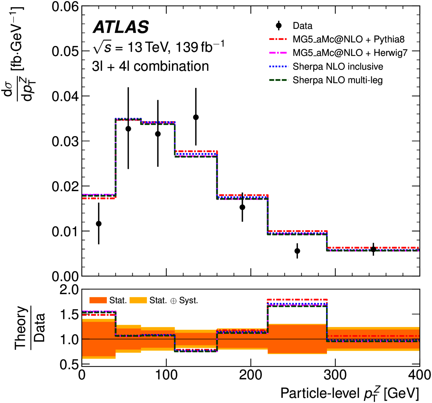 頂對(duì) + Z 事件的產(chǎn)生在某種程度上更容易觀察,這要?dú)w功于 Z 玻色子明顯衰減為兩個(gè)電子或兩個(gè) μ 子,可以有效地重建,而與其他過(guò)程混淆的可能性很小。借助完整的 Run-2 數(shù)據(jù)集,ATLAS 物理學(xué)家已經(jīng)分離出足夠多的頂對(duì) + Z 事件,不僅可以測(cè)量速率,還可以研究 Z 玻色子的動(dòng)量分布,如圖 6 所示。事件的最大部分具有 Z -玻色子動(dòng)量值 (p T Z ) 大約為 100 GeV,并且事件的總體速率和 p T Z分布的形狀都被理論預(yù)測(cè)很好地再現(xiàn)了。