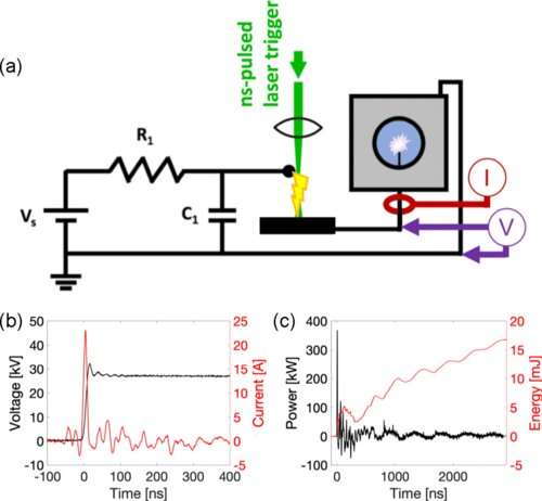 (a) 激光觸發的驅動電路圖,(b) 一個典型事件的電壓和電流軌跡。(c) 通過直接整合計算出的功率和能量。資料來源:德克薩斯A&M大學