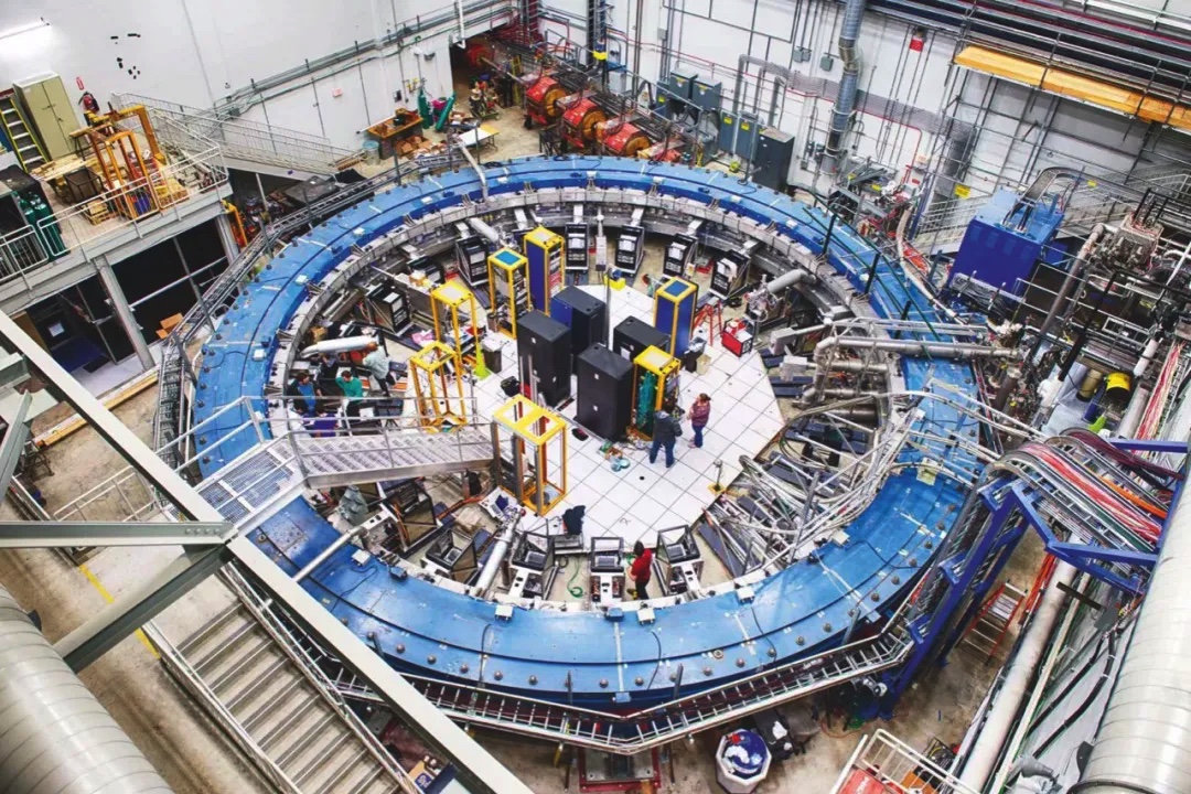繆子是最早為人類所知的不穩定粒子之一,其發現可以追溯到1936年。它是電子的加重版本,和電子一樣帶有負電荷。繆子的壽命約為2微秒,這在粒子物理學家眼里已經是很長的時間了,因此這種粒子能夠得到精確測量。繆子的磁矩決定了其自旋軸繞磁力線運行的速度。為了在費米實驗室進行測量,物理學家制造出繆子,并用強磁鐵將它們約束在直徑約15米的圓周上運動。繆子最終會衰變,由衰變產物的分布就可以推斷出它們的磁矩。