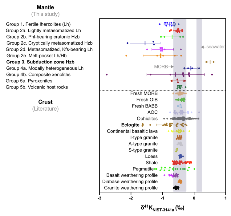該研究指出Tariat地區的二輝橄欖巖代表了陸下巖石圈地幔的鉀同位素組成,平均δ41K為-0.65±0.30‰,略低于大洋玄武巖,但整體在大洋玄武巖范圍內,陸下巖石圈地幔具有大的鉀同位素變化范圍,可能反映了熔融后的鉀元素再分配(圖1和2)。另外,結合Group 1最富沃的二輝橄欖巖和Group 2a輕微交代的二輝橄欖巖可以獲得正常非克拉通巖石圈地幔的鉀同位素組成為-0.57±0.28‰,該結果也與大洋玄武巖鉀同位素組成參考值(-0.43±0.17‰)一致。