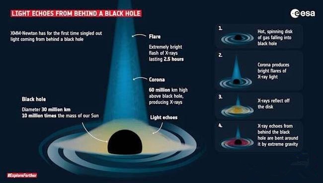 該團隊表示,當科學家在觀察8億光年外星系中心的超大質量黑洞發出的X射線時,注意到了一系列明亮的X射線耀斑。他們還觀察到更多比耀斑亮度更小、發出時間更晚,而且具有不同顏色的“光回波”。這是天文學家第一次觀察到光從黑洞背面反射出來的“回波”。
