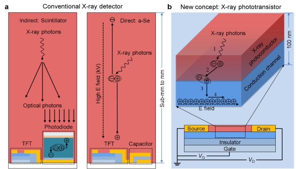 圖1.a、傳統(tǒng)X射線探測(cè)器中,間接探測(cè)(左)使用閃爍體材料與光電二極管可見(jiàn)光探測(cè)器相互集成,X射線通過(guò)閃爍體材料轉(zhuǎn)換為可見(jiàn)光,可見(jiàn)光由光電二極管探測(cè)器探測(cè);直接探測(cè)(右)使用如非晶硒等半導(dǎo)體材料,半導(dǎo)體吸收X射線后直接產(chǎn)生電子-孔穴對(duì),在半導(dǎo)體材料上施加高電場(chǎng),分離和收集電子-空穴對(duì);b、X射線光電晶體管結(jié)構(gòu),異質(zhì)結(jié)中電子-空穴對(duì)產(chǎn)生(1)、分離(2)、電子捕獲/空穴注入(3)和空穴再循環(huán)(4)產(chǎn)生高增益效應(yīng)的過(guò)程圖示